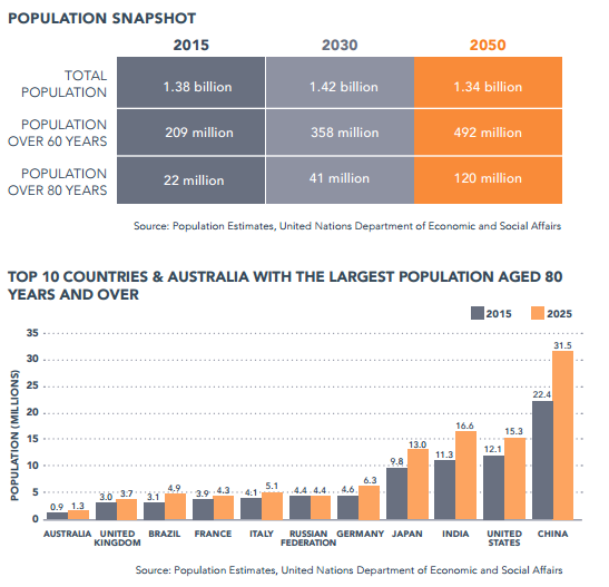 Currently, China has a population of 1.38 billion people and comprises of the largest ageing population in the world. There are currently 209 million people aged 60 years and over and 22 million people aged 80 years and over. While the total population of China is expected to stagnate, the proportion of people aged 60 years and above will rise from 15.2% to 36.5% while people aged 80 years and over is expected to increase from 1.9% to 8.9%. The rapid shift in the country’s demographic composition will present itself with a number of challenges in the future.