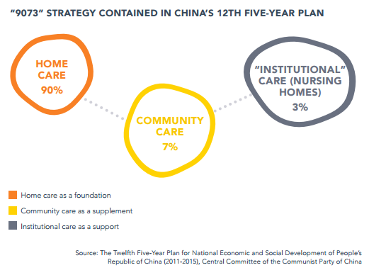 China’s Five-Year Plan sets out the Chinese government’s overarching strategy and targets for economic and social development over a five-year period. For China’s 12th Five-Year Plan (2011-2015) the government outlined the “9073” or “9064” framework to support its ageing population. The strategy aims for approximately 90% of the population aged 60 years and above to age at home and be cared for their families, 7% or 6% receiving support from community based care, and 3% or 4% requiring residential aged care.