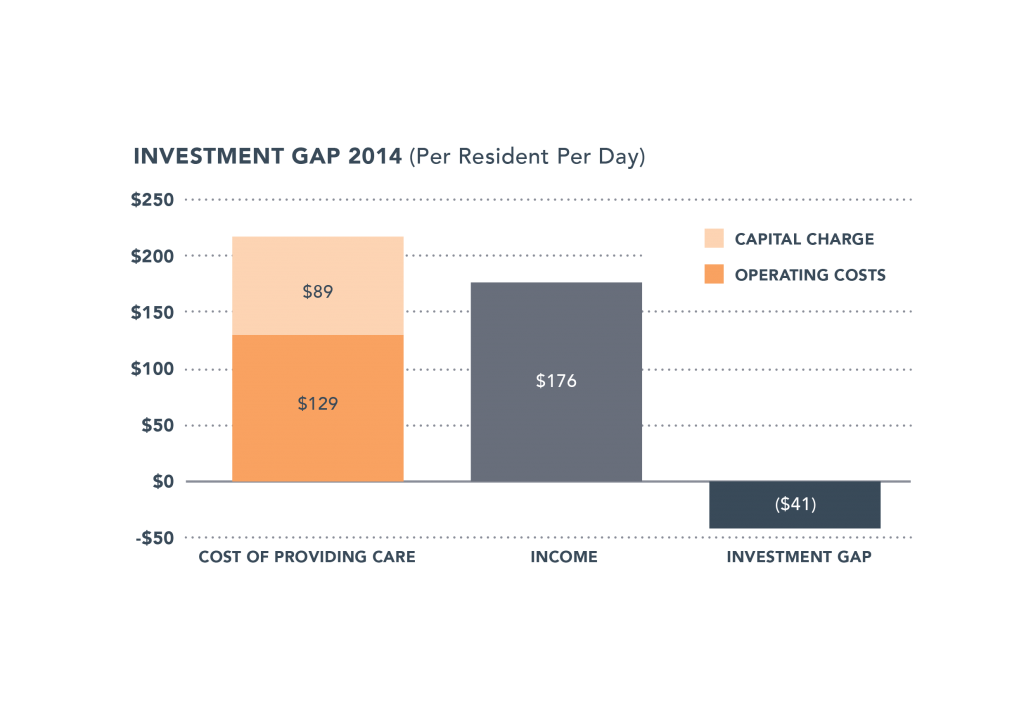 The financial modelling of services operating in modern, contemporary environments revealed that operating costs had increased 17% since the 2010 study and the costs of construction for new homes had grown by 15%. Subsidy increases, particularly for dementia services, have helped to defray escalating costs, however, the study shows that net returns to operators continue to be inadequate to support the cost of building new facilities (the Investment Gap).