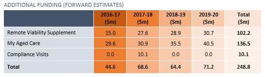 It appears, however, that only $249 million has been allocated to improve aged care services. This appears somewhat tokenistic given the scale of the cuts and the magnitude of the funding shortfall in regional and remote areas.