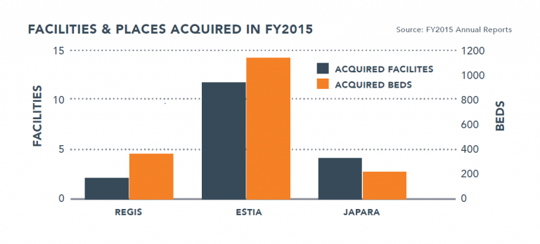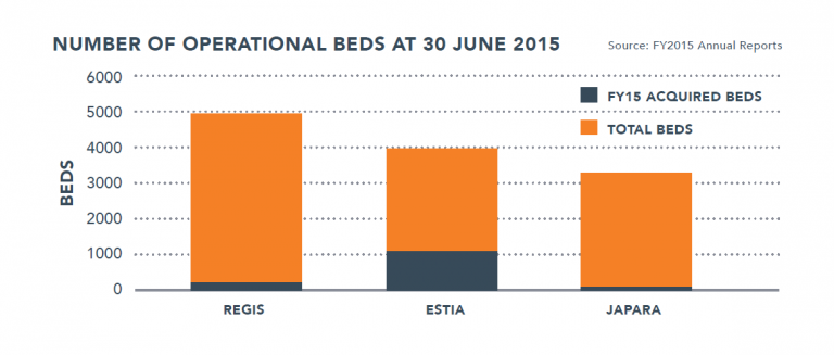 Estia achieved the highest number of acquisitions during the 2015 financial year, acquiring 12 new facilities and an additional 1,123 beds. This represents a massive increase in their national portfolio, with additional beds representing 28% of their current portfolio.