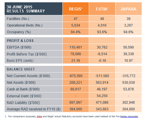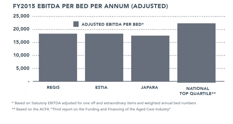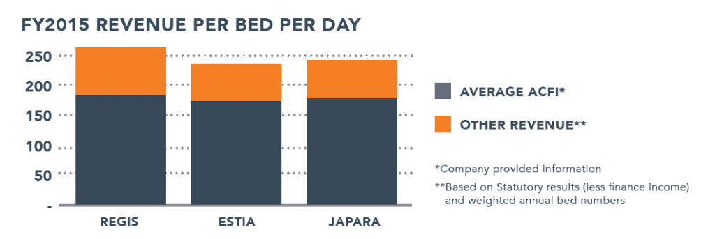 The most prominent difference between the three listed entities is their respective EBITDA performance. Negatively impacting Estia’s results are one- off costs relating to the acquisition of Cook Care and Padman Health and the acquisition of 12 facilities. Estia incurred $30.7M in one-off acquisition costs during FY15.
