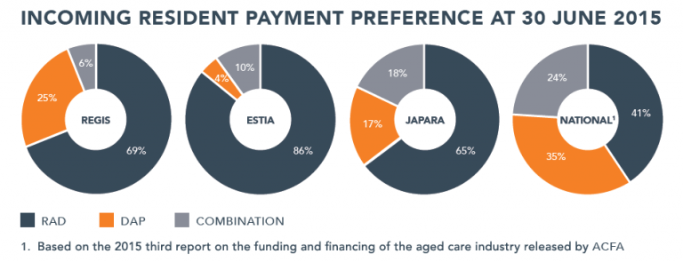 Regis and Japara have a higher proportion of residents paying Daily Accommodation Payments (DAP) and combination payments of part Refundable Accommodation Payments (RAD) and part DAP, which favourably impacts operating results.